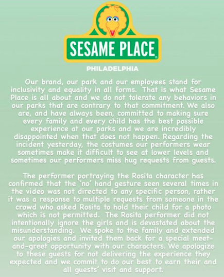 Following instagram user __jodiii__ posting the initial video of her two young daughter’s being passed up for hugs at the parade, Sesame Place issued an explanation and apology. In a statement posted to their instagram page, they wrote: