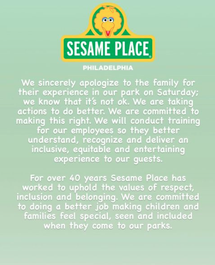 “Our brand, our park and our employees stand for inclusivity and equality in all forms. That is what Sesame Place is about and we do not tolerate any behaviors in our parks that are contrary to that commitment. We also are, and have always been, committed to making sure every family and every child has the best possible experience at our parks and we are incredibly disappointed when that does not happen.”