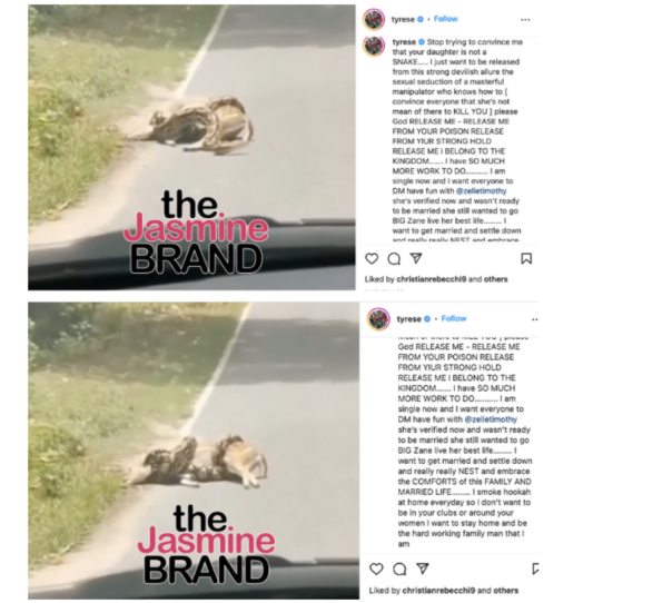 The moving apology follows the couple’s bizarre breakup that took place via Instagram on July 7. As previously reported, Tyrese, born Tyrese Gibson, announced he’s single and his “ex-girlfriend” Zelie (at the time) is back on the market. The ‘Baby Boy’ actor posted a video of a snake attempting to strangle a deer – seemingly comparing Zelie, 27, to the predator. In a lengthy caption he said: