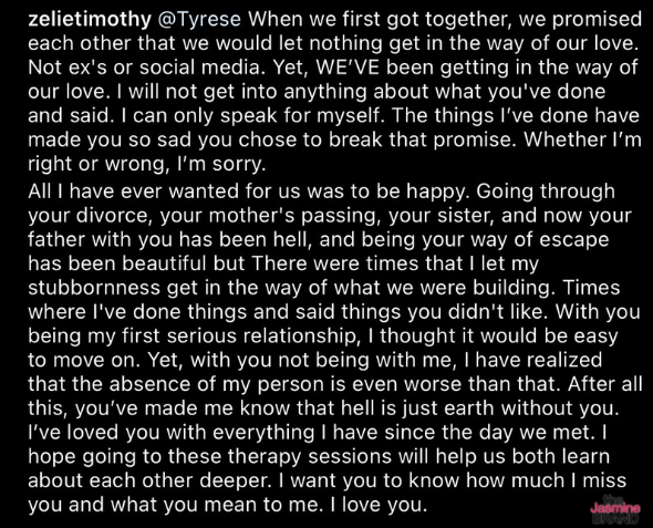 “@Tyrese When we first got together, we promised each other that we would let nothing get in the way of our love. Not ex’s or social media. Yet, WE’VE been getting in the way of our love. I will not get into anything about what you’ve done and said. I can only speak for myself. The things I’ve done have made you so sad you chose to break that promise.”