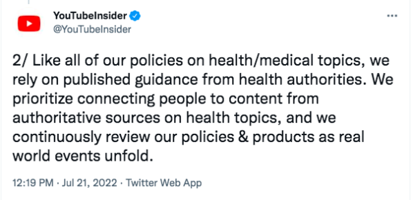 “Like all of our policies on health/medical topics, we rely on published guidance from health authorities. We prioritize connecting people to content from authoritative sources on health topics, and we continuously review our policies & products as real world events unfold.”