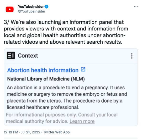 In addition to that, YouTube also said it is launching an information panel that will give its audience “context and information” from health authorities. This new feature will appear below abortion-related videos and above relevant search results.