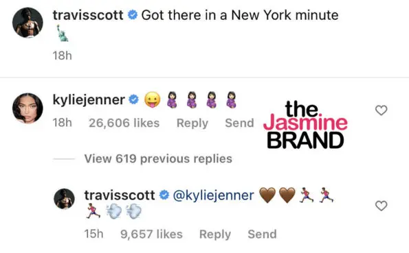 Travis Scott’s girlfriend and mother of his two children, Kylie Jenner, 24, took to the IG comments with a flirtatious response. She responded to the photo via IG comment with a tongue-out emoji, followed by four pregnant women emojis that has social media users speculating that the television personality is pregnant again or wants the “Sicko Mode” rapper to give her another baby.