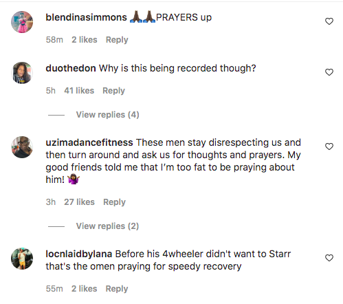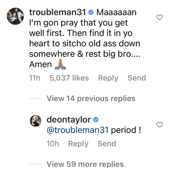 “Maaaaaan I’m gon pray that you get well first. Then find it in yo heart to sitcho old a** down somewhere & rest big bro…. Amen [praying hands emoji].”