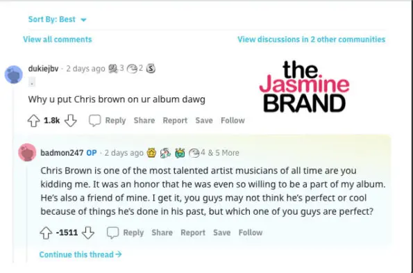 “Chris Brown is one of the most talented artist musicians of all time are you kidding me. It was an honor that he was even so willing to be a part of my album. He’s also a friend of mine. I get it, you guys may not think he’s perfect or cool because of things he’s done in his past, but which one of you guys are perfect?”