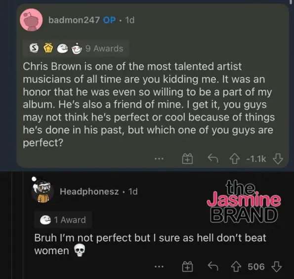 As a response, the “Raising Kanan” actor’s reply was hit with many downvotes by the community on his Reddit AMA (Ask Me Anything). Some users took to the comments and referenced Chris Brown’s violent past with ex-girlfriend Rihanna, 34. One user commented: