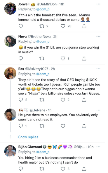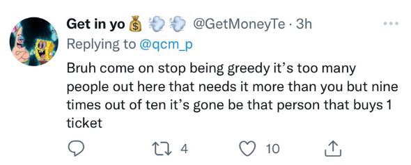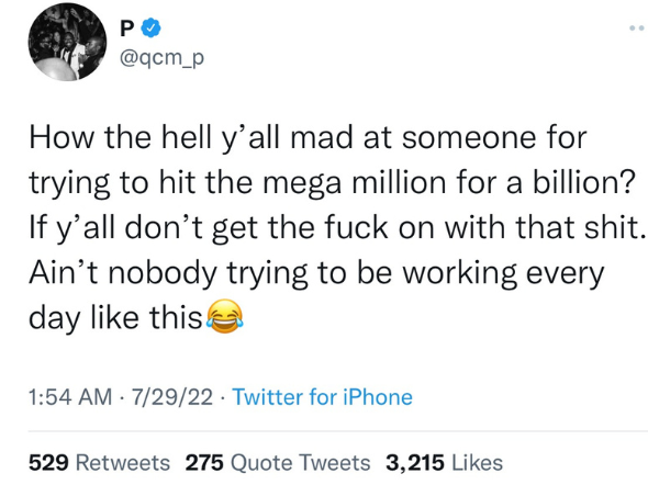 “How the hell y’all mad at someone for trying to hit the mega million for a billion? If y’all don’t get the f*ck on with that sh*t. Ain’t nobody trying to be working every day like this.”