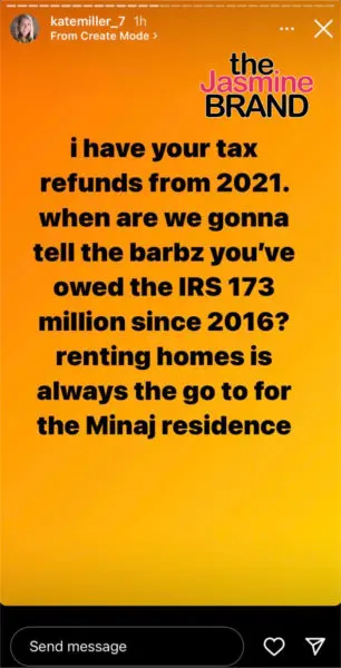 “i have your tax refunds from 2021. when are we gonna tell the barbz you’ve owed the IRS 173 million since 2016? renting homes is always the go to for the Minaj residence”