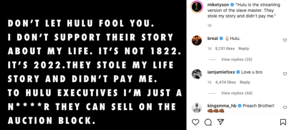 And followed up, making it perfectly clear he is not in support of the upcoming limited series. Captioning the Instagram post, “Hulu is the streaming version of the slave master. They stole my story and didn’t pay me.” Tyson wrote: