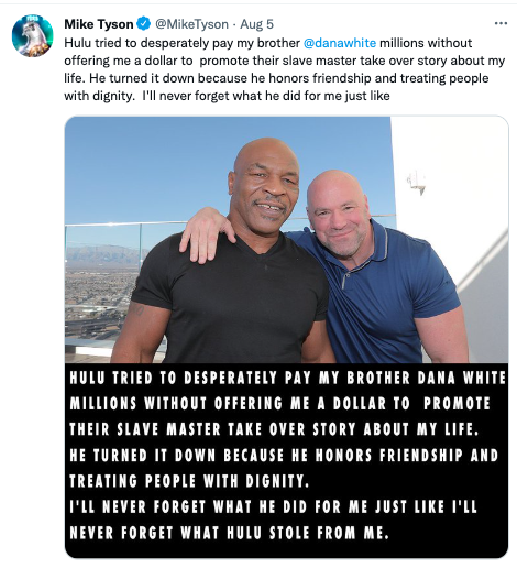 “Hulu tried to desperately pay my brother @danawhite millions without offering me a dollar to promote their slave master take over story about my life. He turned it down because he honors friendship and treating people with dignity. I’ll never forget what he did for me just like I’ll never forget what Hulu stole from me. (2/2)”