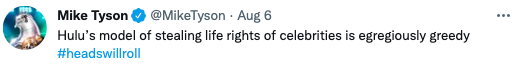 “Hulu’s announcement to do an unauthorized mini-series of the Tyson story without compensation, although unfortunate, isn’t surprising….This announcement on the heels of social disparities in our country is a prime example of how Hulu’s corporate greed led to this tone-deaf cultural misappropriation of the Tyson life story.”