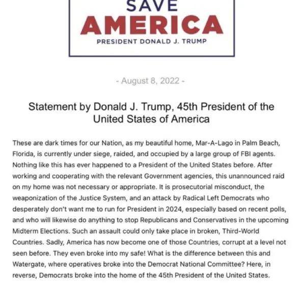 “These are dark times for our Nation, as my beautiful home, Mar-A-Lago in Palm Beach, Florida, is currently under siege, raided, and occupied by a large group of FBI agents. Nothing like this has ever happened to a President of the United States before. After working and cooperating with the relevant Government agencies, this unannounced raid on my home was not necessary or appropriate.”