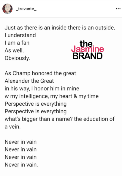 “As Champ honored the great. Alexander the Great in his way, I honor him in mine with my intelligence, my heart & my time. Perspective is everything. Perspective is everything. What’s bigger than a name? The education of a vein.”