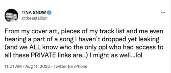 “From my cover art, pieces of my track list and me even hearing a part of a song I haven’t dropped yet leaking (and we ALL know who the only ppl who had access to all these PRIVATE links are..) I might as well…lol.”