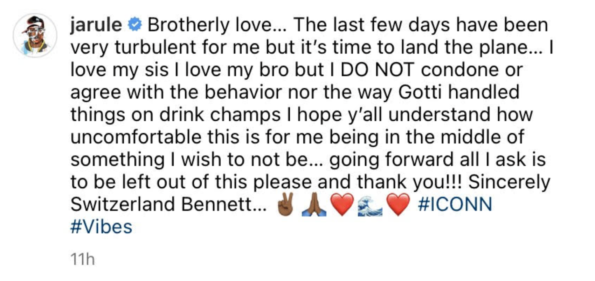 “I love my sis I love my bro but I DO NOT condone or agree with the behavior nor the way Gotti handled things on drink champs. I hope y’all understand how uncomfortable this is for me being in the middle of something I wish to not be…”