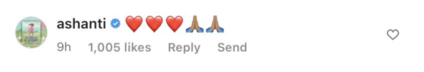 Ashanti, born Ashanti Shequoiya Douglas, responded to her Murder Inc. colleague showing love with a few hearts and praying hands’ emojis.