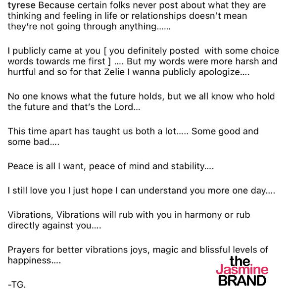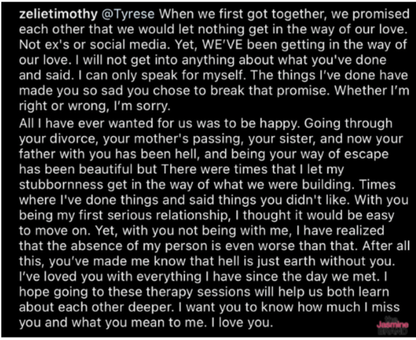 “@Tyrese When we first got together, we promised each other that we would let nothing get in the way of our love. Not ex’s or social media. Yet, WE’VE been getting in the way of our love. I will not get into anything about what you’ve done and said. I can only speak for myself. The things I’ve done have made you so sad you chose to break that promise.”