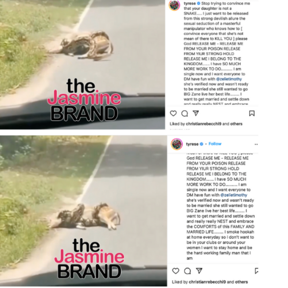 The moving apology stems from the couple’s abrupt social media break-up that took place on July 7. As previously reported, Tyrese, born Tyrese Gibson, announced he’s single and his “ex-girlfriend” Zelie (at the time) is up for grabs in a now-deleted post. The ‘Baby Boy’ actor uploaded a video of a snake attempting to strangle a deer, seemingly comparing the 27-year-old to the predator. He said in a lengthy caption: