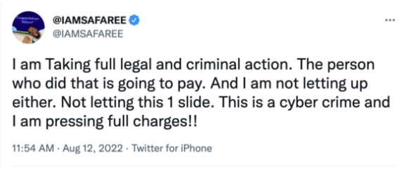 “I am Taking full legal and criminal action. The person who did that is going to pay. And I am not letting up either. Not letting this 1 slide. This is a cyber crime and I am pressing full charges!!”