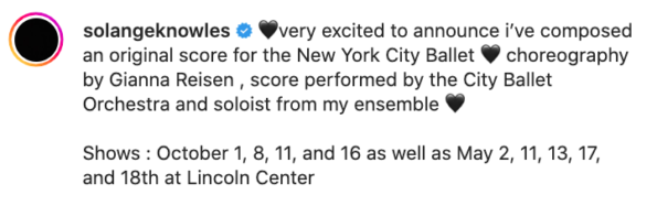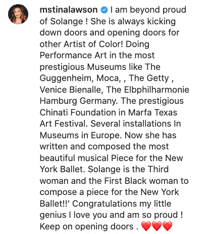 “I am beyond proud of Solange ! She is always kicking down doors and opening doors for other Artist of Color! Doing Performance Art in the most prestigious Museums like The Guggenheim, Moca, , The Getty , Venice Bienalle, The Elbphilharmonie Hamburg Germany. The prestigious Chinati Foundation in Marfa Texas Art Festival. Several installations In Museums in Europe. Now she has written and composed the most beautiful musical Piece for the New York Ballet. Solange is the Third woman and the First Black woman to compose a piece for the New York Ballet!!’ Congratulations my little genius I love you and am so proud ! Keep on opening doors . read the article in the New York Times”