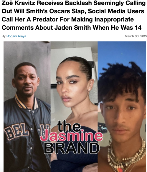 Subsequent her comment about the slap, Kravitz was hounded by Smith supporters who unearthed previous “inappropriate” comments she made about Smith’s son Jaden. Social media users labeled the actress a “predator” due to her apparent gushing over Jaden after the two co-starred in a film together.