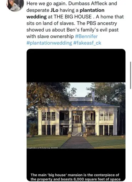 “J.LO and Ben having their wedding on a plantation doesn’t surprise me…both give off racist vibes.”