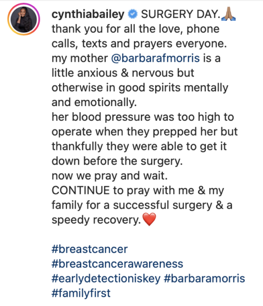 “SURGERY DAY. Thank you for all the love, phone calls, texts and prayers everyone. my mother @barbarafmorris is a little anxious & nervous but otherwise in good spirits mentally and emotionally.”