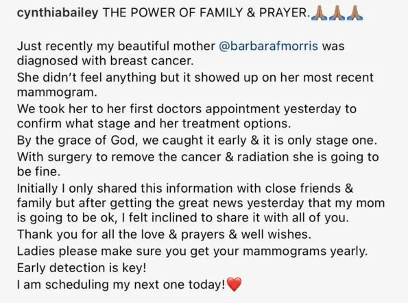 “THE POWER OF FAMILY & PRAYER. Just recently my beautiful mother @barbarafmorris was diagnosed with breast cancer. She didn’t feel anything but it showed up on her most recent mammogram.”