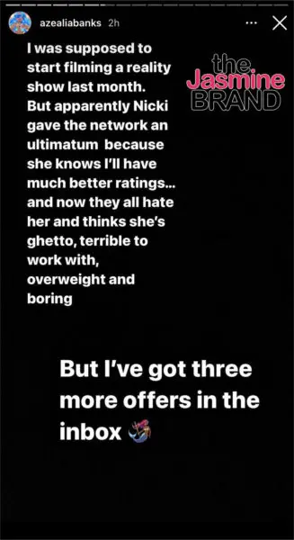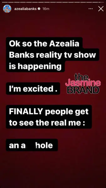 Shortly after Azealia Banks shared the cryptic post, she followed with a shorter text via her IG stories and shared her excitement for the reality TV show that’s apparently still happening. Banks added,