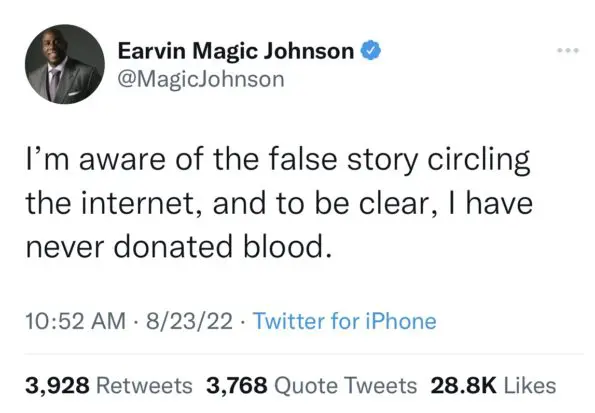 On Tuesday (Aug. 23) Magic Johnson took to Twitter to address the post about him donating blood. He tweeted,