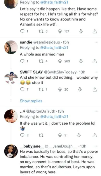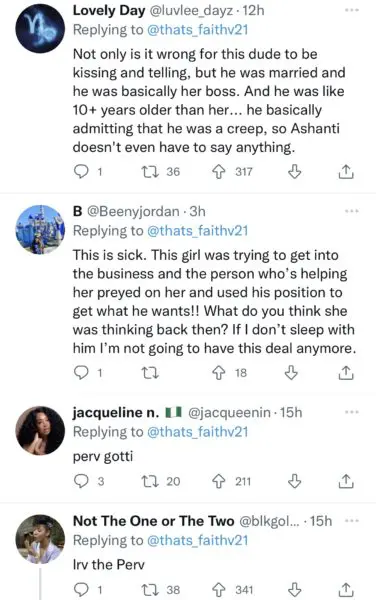 “Irv is over a 10+ years older than Ashanti. We need to stop acting like it’s okay for a 30+ y/o producer/label owner to get involved w/ a 19 y/o singer trying to break into the biz. The power dynamics are not even CLOSE to be equal, & that’s before we even talk about Irv’s wife.”