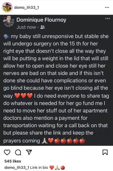 While the famed dancer was fighting for her life in a hospital bed, Apple’s sister, Dominique Flournoy, ran her Instagram account regularly for fans to stay up-to-date on Apple’s road to recovery. A GoFundMe fundraiser was also organized by Dominique Flournoy for fans and supporters to contribute any help with