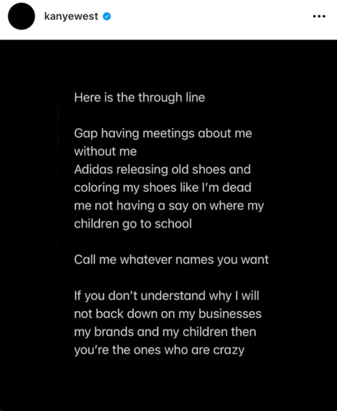 “Here is the through line. Gap having meetings about me without me. Adidas releasing old shoes and coloring my shoes like I’m dead me not having a say on where my children go to school.”