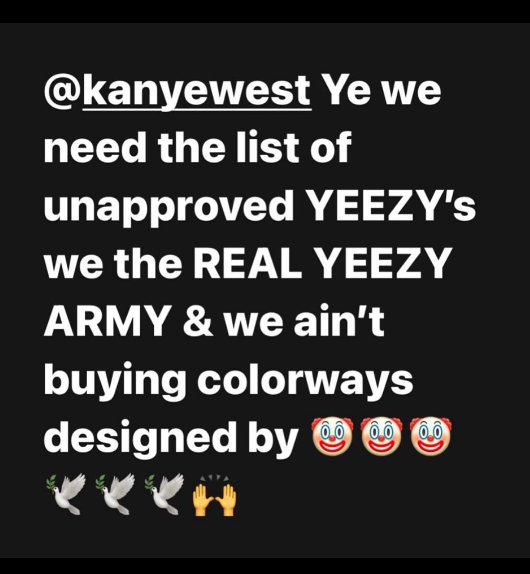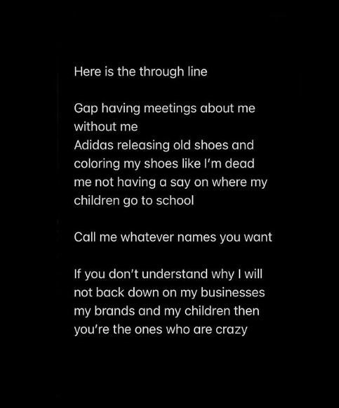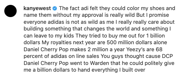 “The fact adi felt they could color my shoes and name them without my approval is really wild But I promise everyone adidas is not as wild as me I really really care about building something that changes the world and something I can leave to my kids They tried to buy me out for 1 billion dollars My royalties next year are 500 million dollars alone Daniel Cherry Pop makes 2 million a year Yeezy’s are 68 percent of adidas on line sales You guys thought cause DCP Daniel Cherry Pop went to Warden that he could politely give me a billion dollars to hand everything I built over”