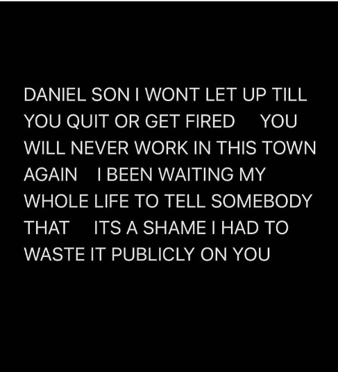 “DANIEL SON I WONT LET UP TILL YOU QUIT OR GET FIRED YOU WILL NEVER WORK IN THIS TOWN AGAIN I BEEN WAITING MY WHOLE LIKE TO TELL SOMEBODY THAT ITS A SHAME I HAD TO WASTE IT PUBLICLY ON YOU”