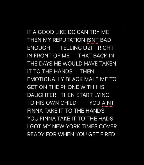 “IF A GOOD LIKE DC CAN TRY ME THEN MY REPUTATION ISNT BAD ENOUGH..TELLING UZI RIGHT IN FRONT OF ME THAT BACK IN THE DAYS HE WOULD HAVE TAKEN IT TO THE HANDS..THEN EMOTIONALLY BLACK MALE ME TO GET ON THE PHONE WITH HIS DAUGHTER THEN START LYING TO HIS OWN CHILD..YOU AINT FINNA TAKE IT TO THE HANDS YOU FINNA TAKE IT TO THE HADS I GOT MY NEW YORK TIMES COVER READY FOR WHEN YOU GET FIRED,”