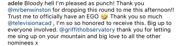 “Bloody hell I’m pleased as punch! Thank you @mrbenwinston for dropping this round to me this afternoon!! Trust me to officially have an EGO ( Thank you so much @televisionacad. I’m so so honored to receive this. Big up to everyone involved. @griffithobservatory thank you for letting me sing up on your mountain and big love to all the other nominees x”
