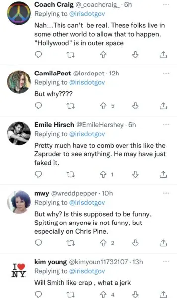 “But why? Is this supposed to be funny. Spitting on anyone is not funny, but especially on Chris Pine.”