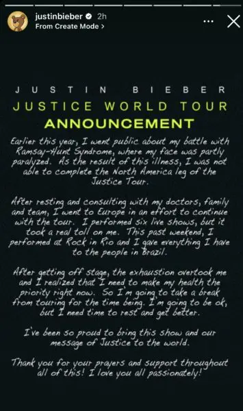 “Earlier this year, I went public about my battle with Ramsay Hunt syndrome, where my face was partly paralyzed. As the result of this illness, I was not able to complete the North America leg of the Justice Tour.”