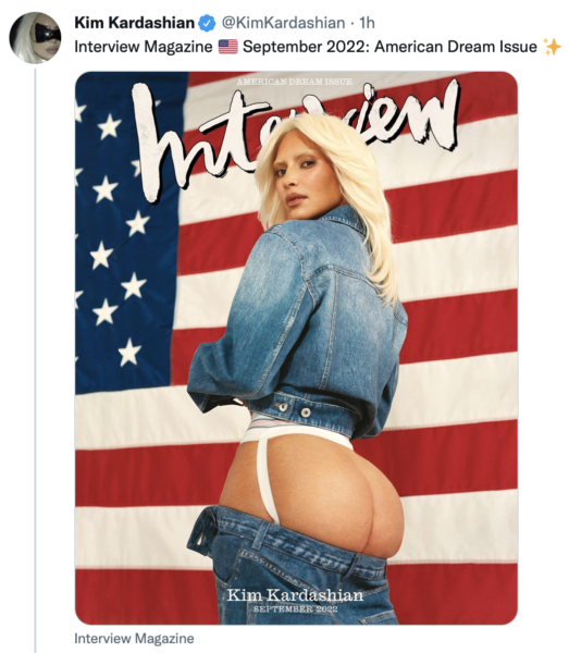 On Tuesday (Sept. 6) Kim Kardashian took to Twitter to share photos of her recent photoshoot with Interview Magazine’s September American Dream Issue. In the images, SKIMS founder Kim Kardashian rocks blonde hair and blonde eyebrows, with different outfits of an American flag bikini, distressed jean jacket, a choker with spikes, and more. The image that drew the most attention shows Kardashian in a jeans jacket, with her butt hanging out of her jeans. The reality star captioned the photo: