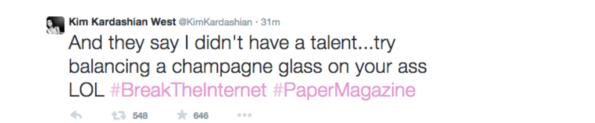 “And they say I didn’t have a talent… try balancing a champagne glass on your ass LOL #BreakTheInternet #PaperMagazine