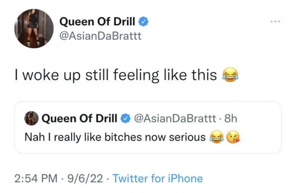 In a tweet, the rapper revealed that she locked lips with a woman for the first time and took pleasure from the experience. In a separate tweet, Asian Doll claimed that she likes girls following her spicy moment with the mystery woman. She said,