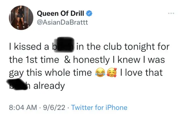 “I kissed a b*tch in the club tonight for the 1st time & honestly I knew I was gay this whole time. I love that b*tch already”