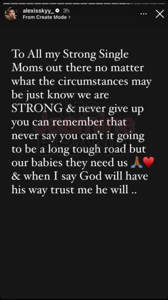 In another IG story upload shortly thereafter, Alexis delivered encouraging words for any single mothers she could possibly reach. She shared,