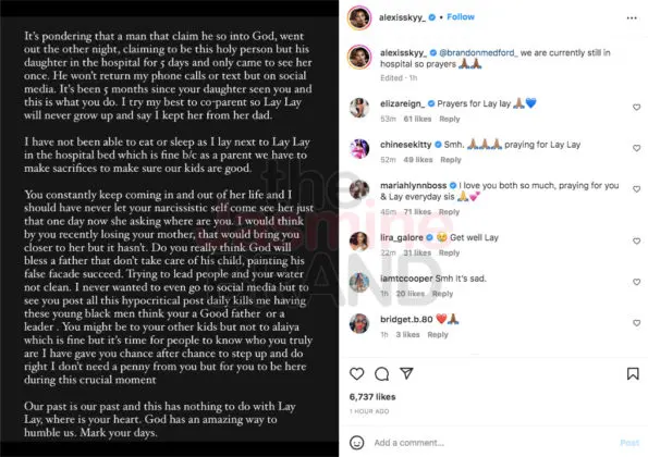 “It’s pondering that a man that claim he so into God, went out the other night, claiming to be this holy person but his daughter in the hospital for 5 days and only came to see her once. He won’t return my phone calls or text but on social media. It’s been 5 months since your daughter seen you and this is what you do. I try my best to co-parent so Lay Lay will never grow up and say I kept her from her dad. I have not been able to eat or sleep as I lay next to Lay Lay in the hospital bed which is fine b/c as a parent we have to make sacrifices to make sure our kids are good. You constantly keep coming in and out of her life and I should have never let your narcissistic self come see her just that one day now she asking where are you. I would think by you recently losing your mother, that would bring you closer to her but it hasn’t. Do you really think God will bless a father that don’t take care of his child, painting his false facade succeed. Trying to lead people and your water not clean. I never wanted to even go to social media but to see you post all this hypocritical post daily kills me having these young black men think your a Good father or a leader. You might be to your other kids but not to alaiya