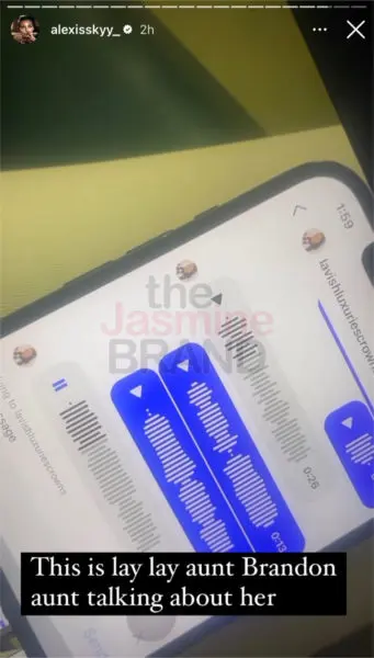 Alexis wrapped up her uploads with a post directed toward Brandon and his sister. In a clip via her IG stories, the social media star played a voice message in which the businessman’s sister can be heard criticizing Alaiya. The woman appears to state,