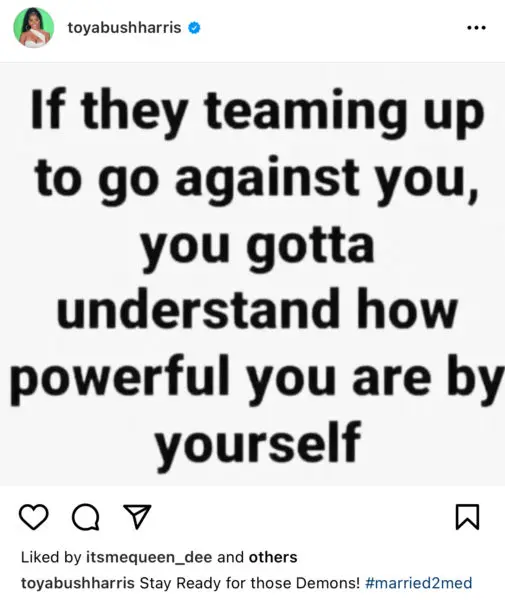 On Sunday (Sept. 11) Toya took to Instagram to seemingly share her thoughts on ‘Married 2 Medicine’s’ recent episode. Toya’s post read: