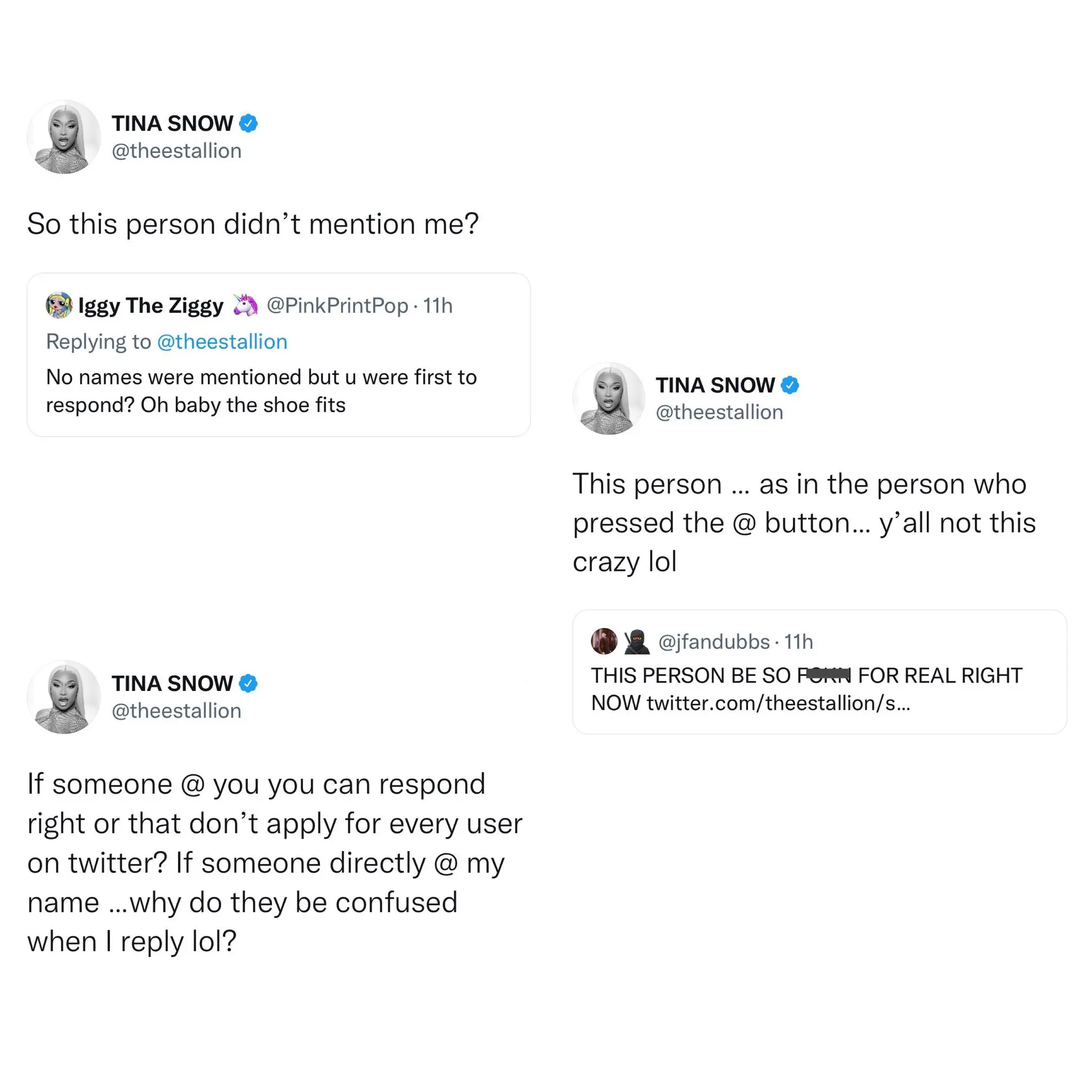 “No names were mentioned but u were the first to respond? Oh baby the shoe fits.”