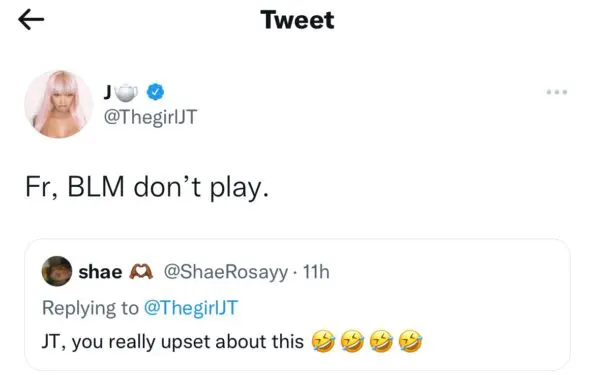 Fans questioned why the rapper was upset over the incident. She stated that it was in support of the Black Lives Matter movement. JT tweeted: