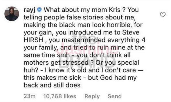 “What about my mom Kris ? You telling people false stories about me, making the black man look horrible, for your gain, you introduced me to Steve HIRSH, you masterminded everything 4 your family, and tried to ruin mine at the same time smh – you don’t think all mothers get stressed? Or you special huh? – I know it’s old and I don’t care this makes me sick – but God had my back and still does”